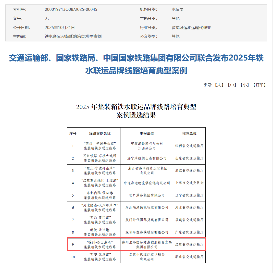 近日,交通運輸部、國家鐵路局、中國國家鐵路集團有限公司聯(lián)合發(fā)布2025年鐵水聯(lián)運品牌線路培育典型案例名單,徐州陸港集團申報的“徐州—連云港港”集裝箱鐵水聯(lián)運線路成功入選,標志著徐州在國家多式聯(lián)運體系建設(shè)和區(qū)域物流樞紐能級提升方面實現(xiàn)重大突破。